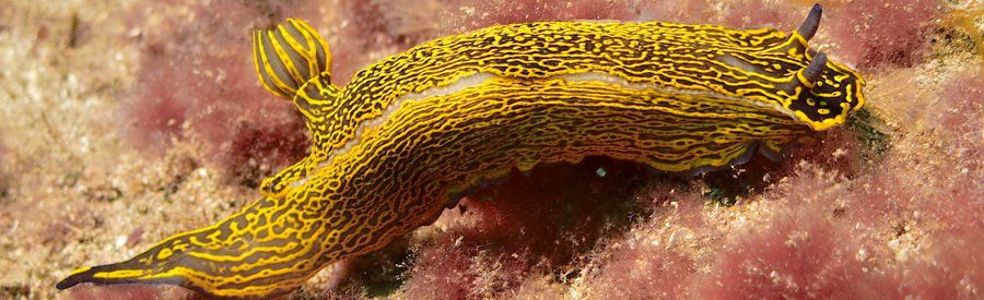 Winter is also the time to find brightly coloured nudibranch on the reef. Hypsellodoris picta is most visible, but look out carefully for Golden Sponge snail and 'vaca suize'´- the cow snail as well.